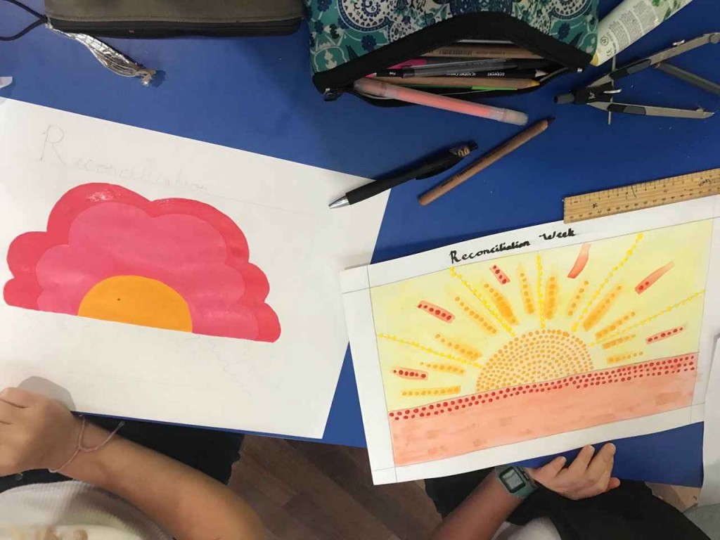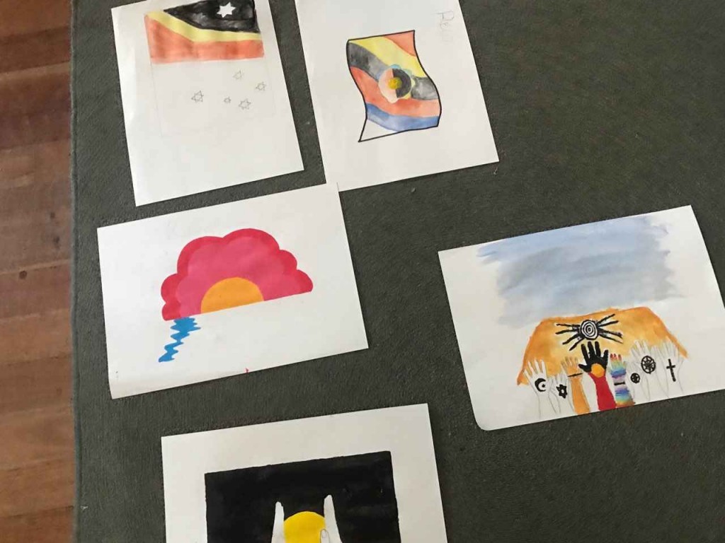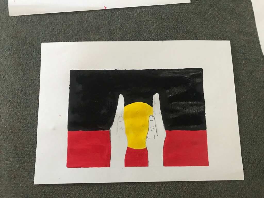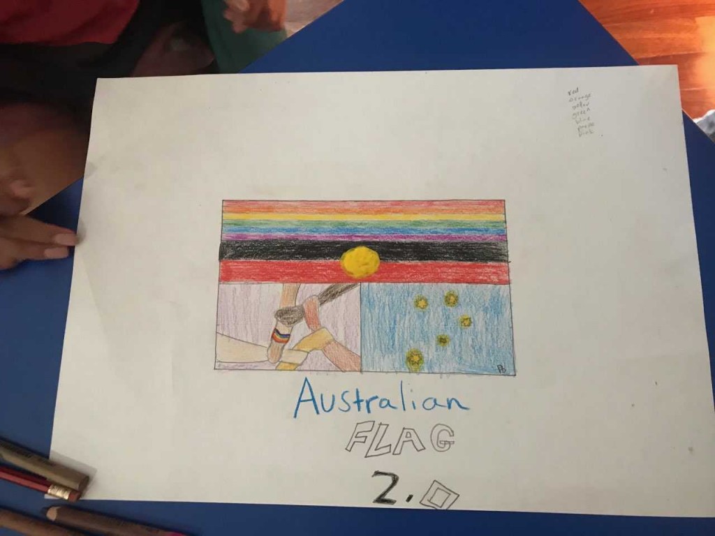Emma, Camps Coordinator and Class relief teacher, worked with Classes 2 and 8 to design a new Australian flag honouring Reconciliation Week last week. Emma explained to the students that the current Australian flag was conceived through a design competition and that now it was their turn! This week the two classes came together to showcase their designs.