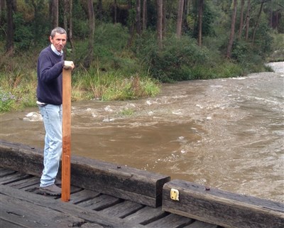Boxtel Flood Measure (400 x 321)When flood water is threatening, we watch the river closely. The maintenance men Sid and John get down there to stand on the deck and measure the water level. While automatic river gauges are a wonderful tool, nothing is better that actually standing on the bridge. On the left is a picture  of John with his fabulous Boxtel River Gauge!